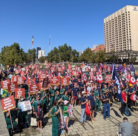 Hundreds of people gathered in Victoria Square for a union rally today, calling on the Marshall Government to better fund fire and ambulance services.