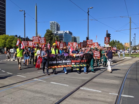 Emergency workers and unions — including the Ambulance Employees Association and United Firefighters Union —marched to Parliament House, rallying for better funding and an end to ambulance ramping.