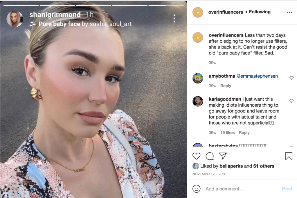 Their bio reads: “Over the fakeness of influencers and their sponsored, filtered, and, filler-filled feeds.”