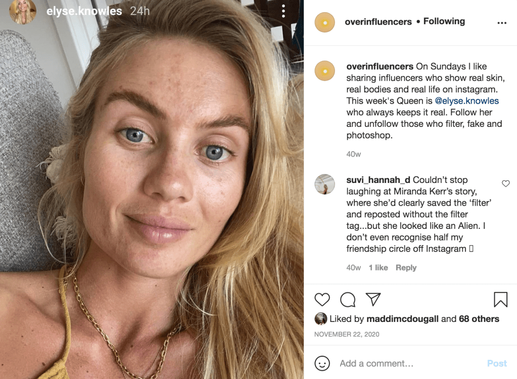 I discerned a few details that paint a picture of what the person behind @overinfluencers might be like: passionate about diversity, inclusion, honesty, transparency, self-love, body positivity, and natural beauty.