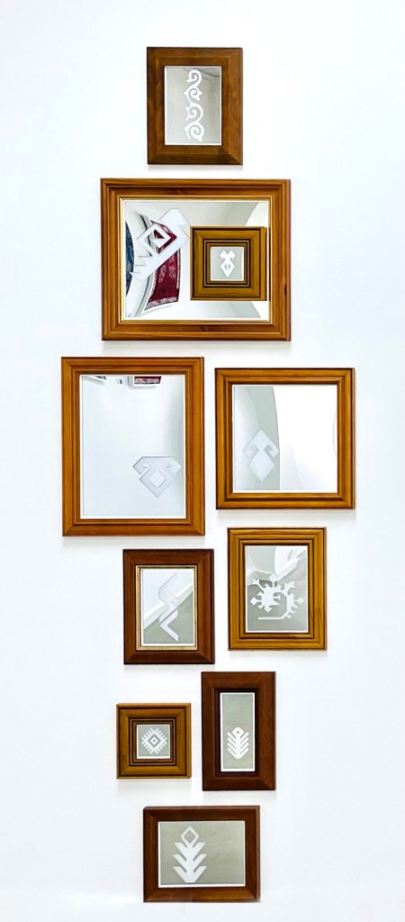Each, she says, reflects a part of her. The symbols reflect her culture, and when a viewer looks into the mirror, it reflects the viewer, but the symbol is engraved on the viewer’s reflection.