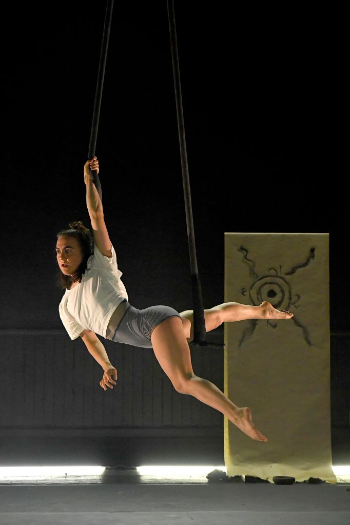 Although the show is not short of aerial feats, light and shadow are used in creative ways to draw attention to the ground – a reminder of the land and place the audience occupy. The use of bright floor lighting at key points in the production emphasises the incongruence in the transitions from playful and lyrical to jolting and conflicted.