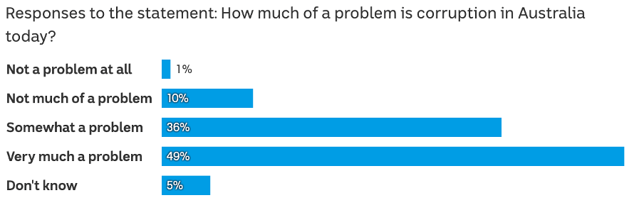 Results from the ABC’s Vote Compass indicate that 85 per cent of Australians feel that corruption is a problem in this country, with only one percent suggesting that it is not a problem at all.