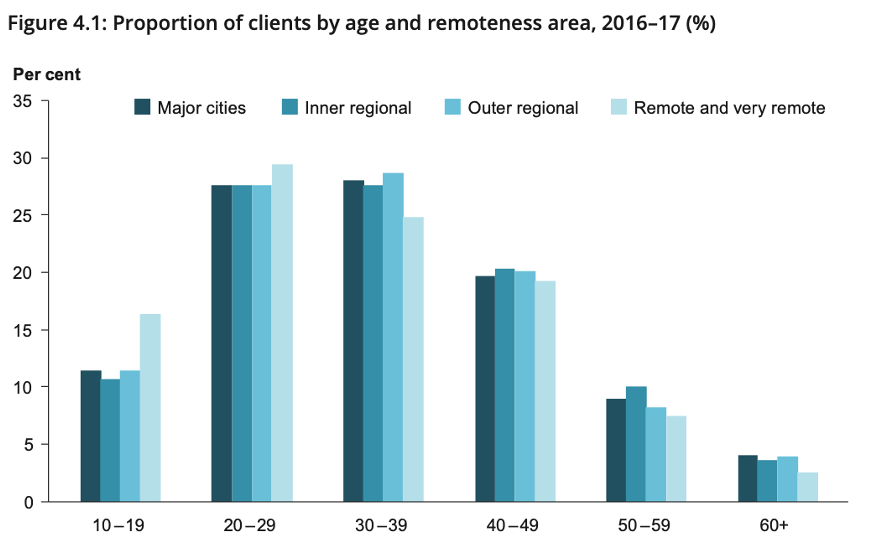 Additionally, the Australian Institute of Health and Welfare (AIHW) suggests that alcohol and drug treatment agencies in rural Australia have the highest rates of clients seeking help across all age demographics.