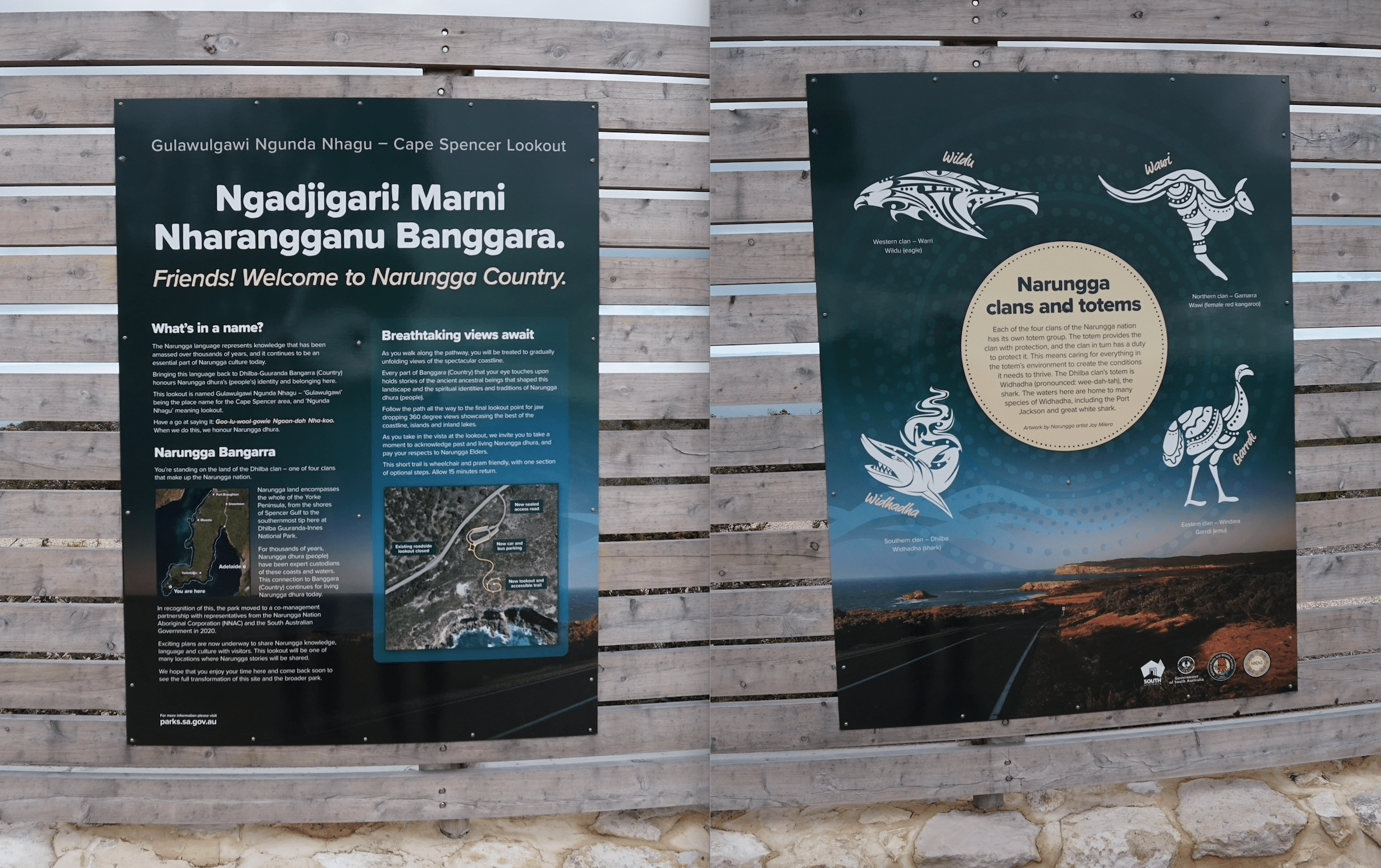 “The co-management only started in 2020?” I asked my partner, out of shock, as we made our way to our first stop within the Dhilba Guuranda Innes National Park: the lookout named Gulawulgawi Ngunda Nhagu. “Gulawulgawi” being the place name for the Cape Spencer area, and “Ngunda Nhagu” meaning “lookout” in Narungga, the Traditional Owners’ language.