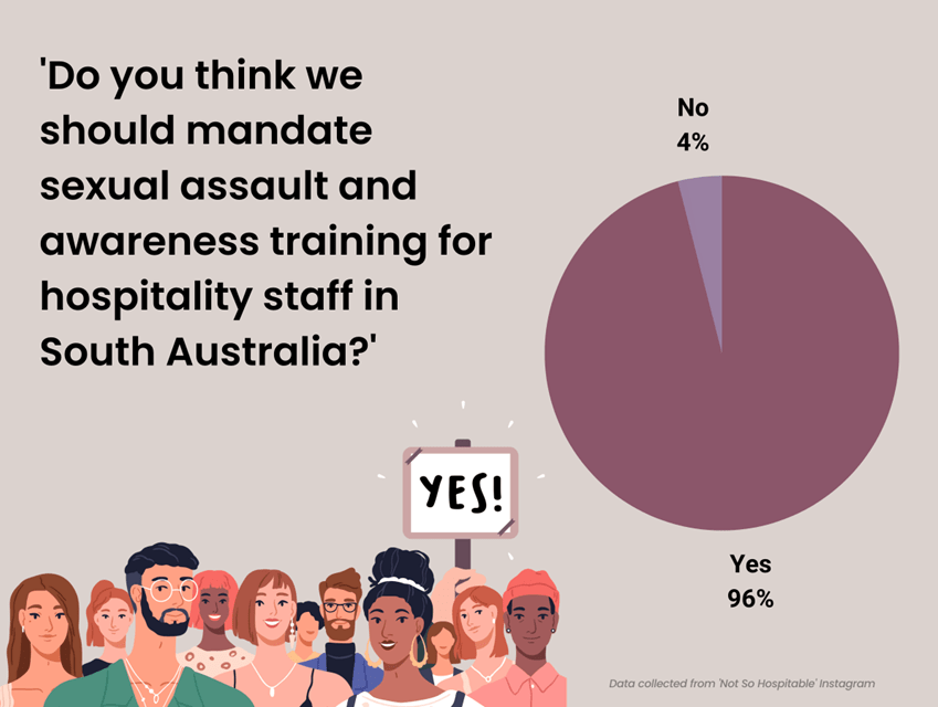 On May 19, 2023, ‘Not So Hospitable’ asked its almost three thousand Instagram followers whether “the State Government should mandate sexual assault and awareness training for hospitality staff in South Australia”.