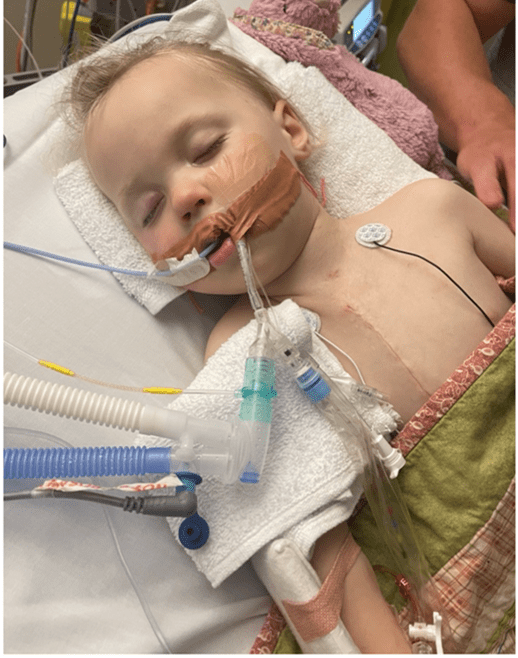 Two years after Tenaya’s birth and her first successful procedure to train the ventricle, she underwent a two-day arterial switch operation. This operation took place on Bella and Mark Ward’s March 2022 wedding anniversary.