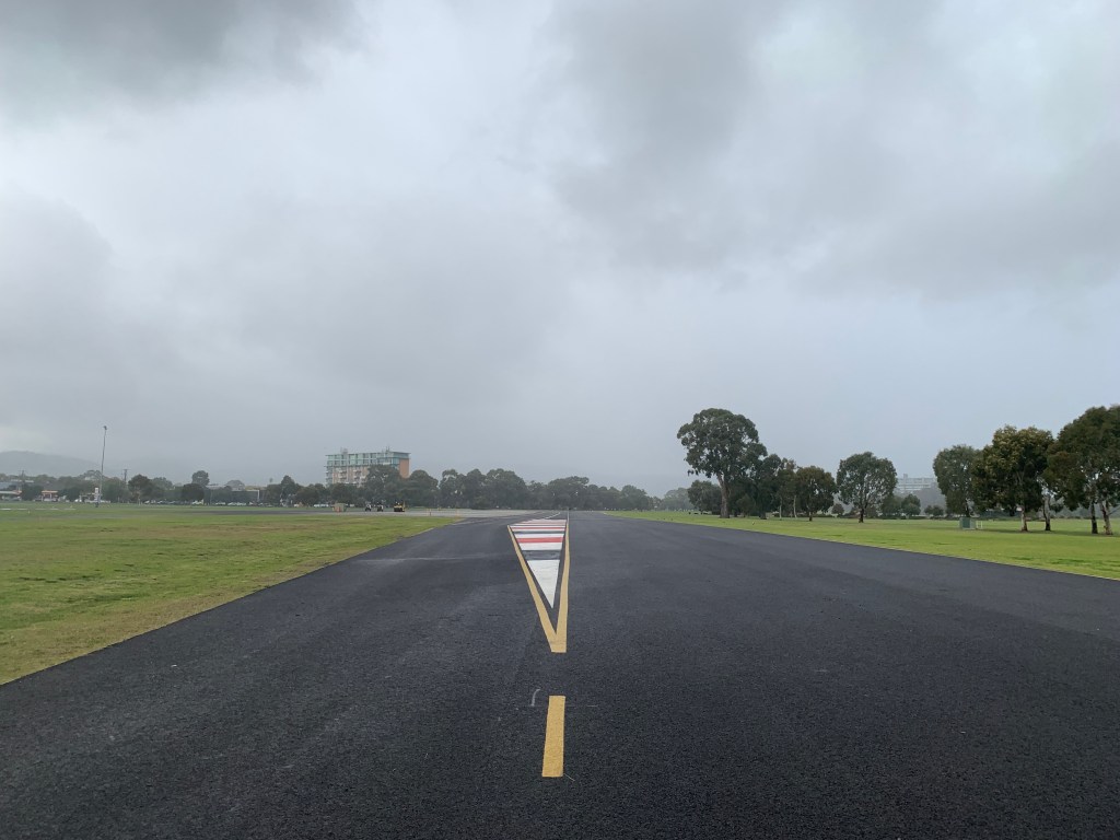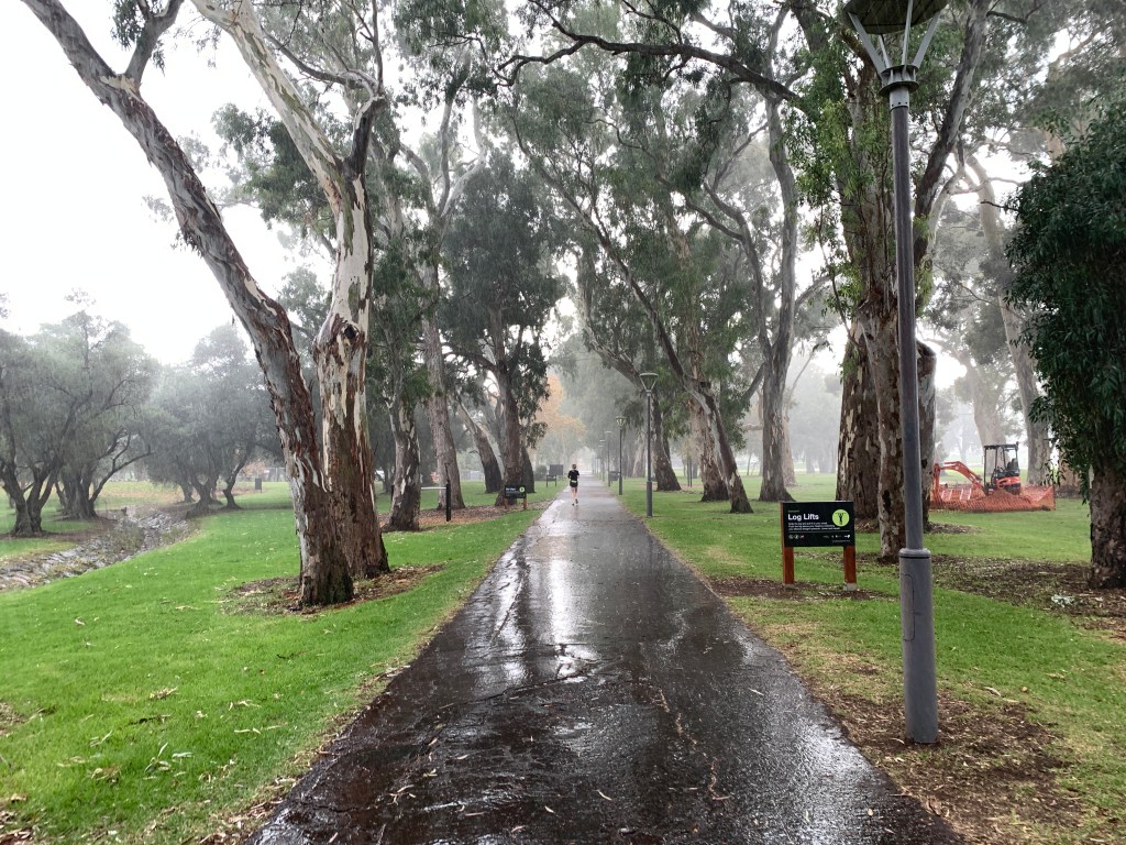 It begins to spit at late morning, a mist growing in the distance and the air growing cooler. It stops a short time later, providing just enough moisture to expel a eucalypt scent along the Park Lands Trail, adjacent to Victoria Park.
