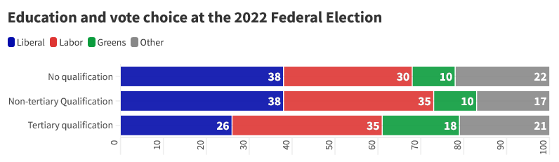 Education and vote choice at the 2022 Federal Election (source: 2022 Australian Election Study)