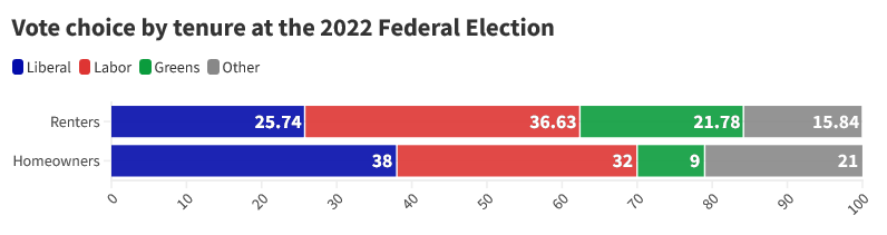 Vote choice by tenure at the 2022 Federal Election (source: 2022 Australian Election Study)