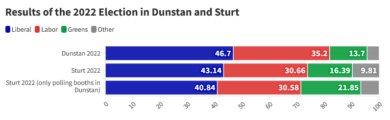 Primary vote in Dunstan at the 2022 South Australian election and primary vote in the overlapping federal seat of Sturt in 2022 Federal election (source: Electoral Commission of South Australia and Australian Electoral Commission)