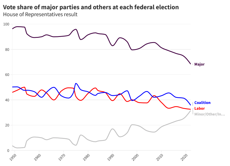 The 2022 federal election was a new low for the major parties, who received 68.28 per cent of votes combined.