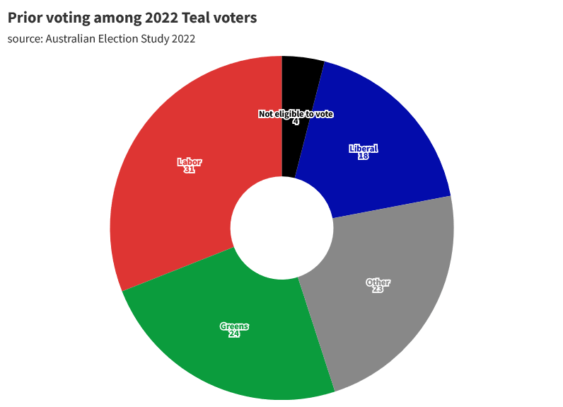 But Teal voters are different. The ideal Teal being a ‘disaffected Liberal voter’ holds some truth but obscures the large proportion of former Labor, Green, and other minor party voters strategically voting to oust the Liberal incumbent.