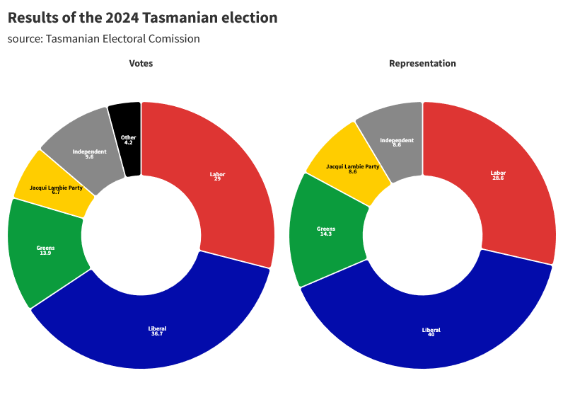 At the Tasmanian election this year, minor parties and independents won 34.33 per cent of the vote and won 31.42 per cent of the seats in the Tasmanian House of Assembly.