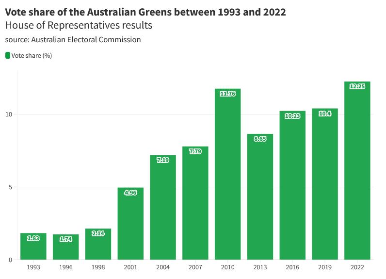 At the last federal election, the Greens won a record vote of 12.25 per cent.