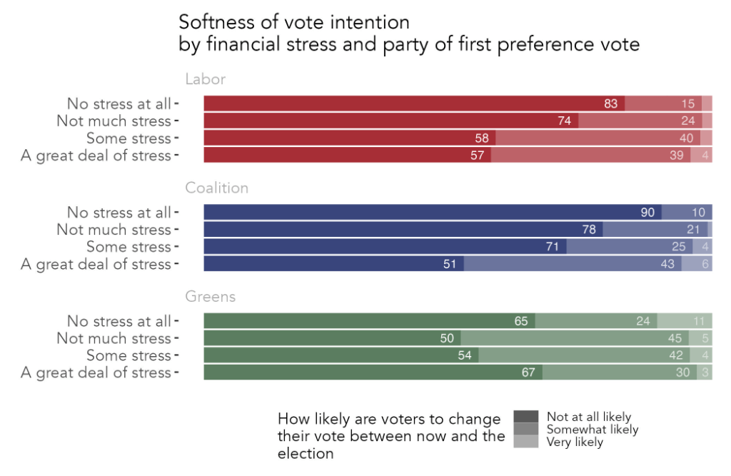 “That, in contrast, [is] 3 per cent with boomers and over for the Greens.” Reported financial stress also correlates with a softness in votes — except for Greens voters.