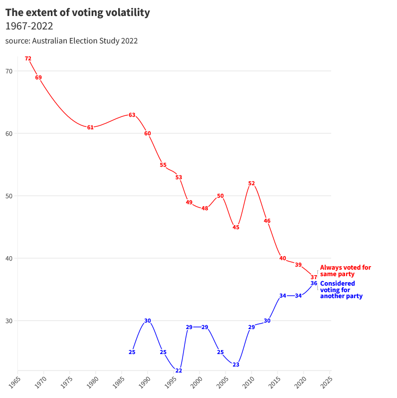 Part of this can be attributed to increasing levels of voting volatility; according to the Australian Election Study 2022, people are now more likely to switch their vote at an election than they have ever been before.