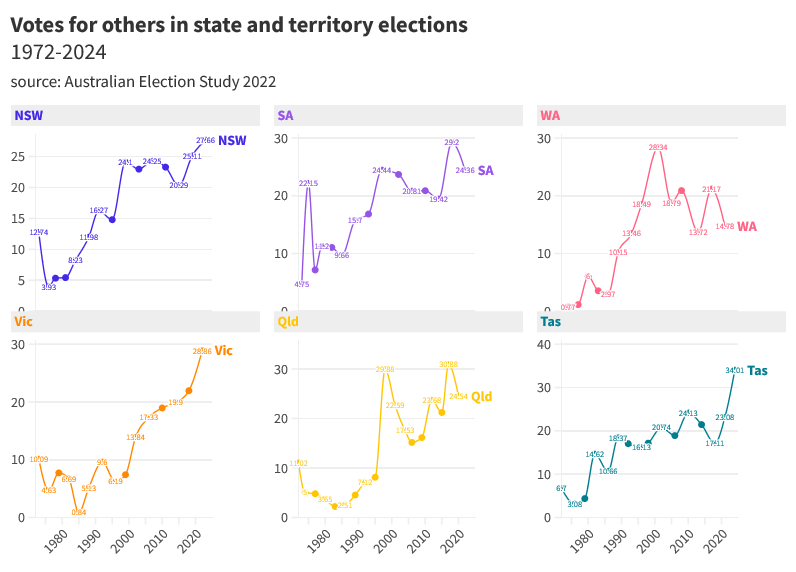 While the representation of minor parties and independents in parliament is at an all-time high, it reflects a gradual increase in votes towards alternatives as the Liberals, the Nationals, and Labor slowly shed votes.
