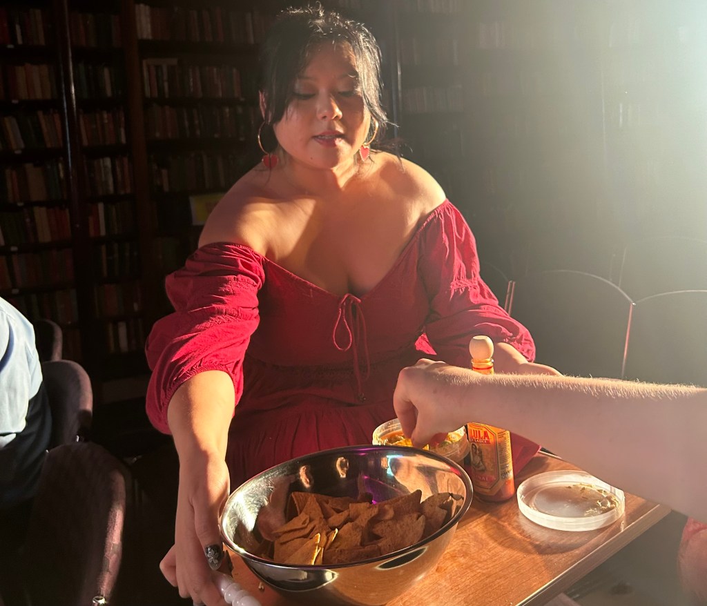 Navas-Nguyen provides a bowl of corn chips, guacamole, and hot sauce to her audience, commending them for taking big scoops of flavour. (Image: Leia Vlahos)