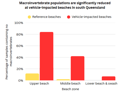 A significantly higher proportion of empty samples at vehicle-impacted beaches shows that vehicles kill macroinvertebrates. (Data source: University of the Sunshine Coast)
