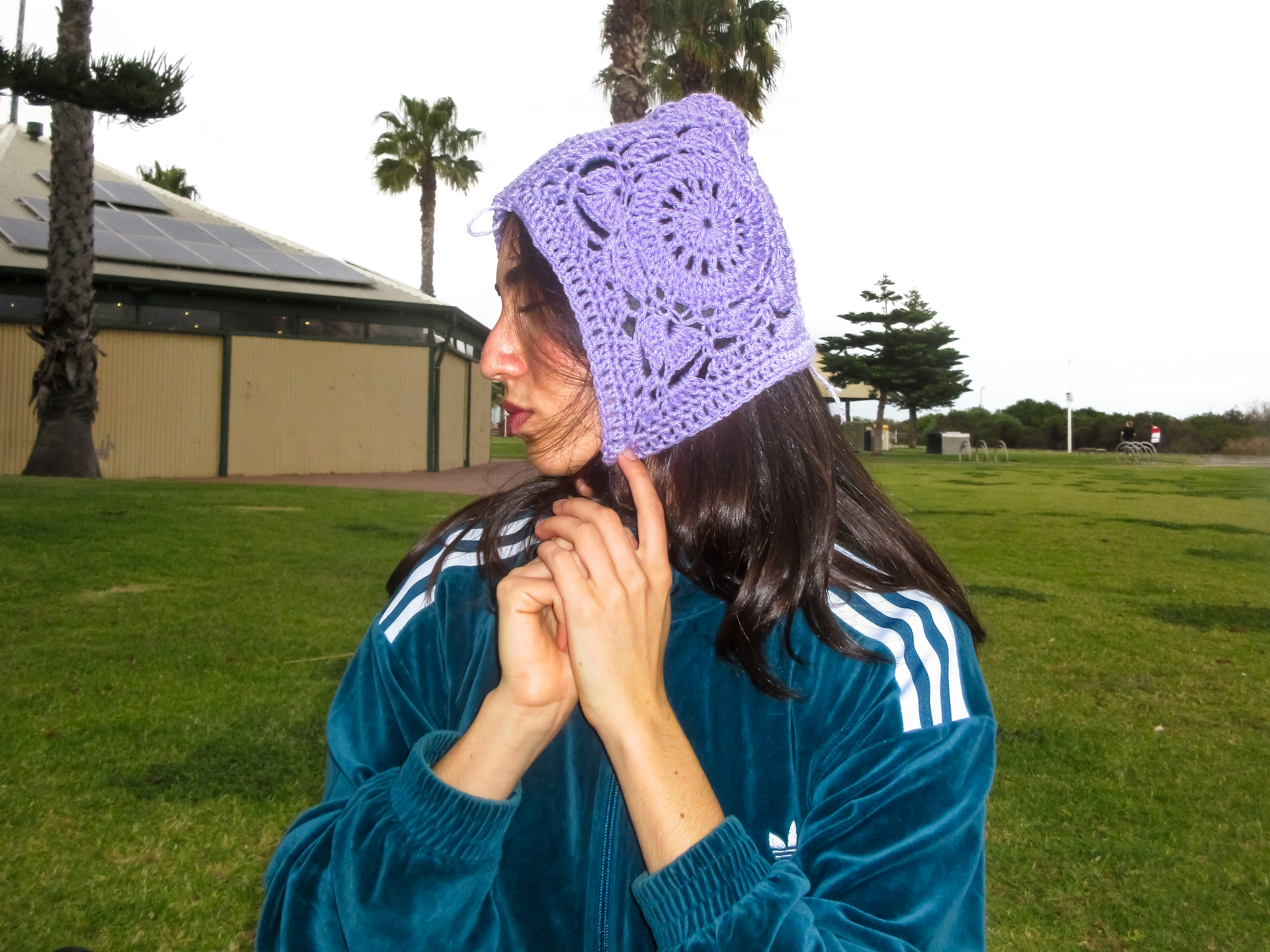 “I’m by no means a master of crochet,” says Davis before opening her handbag to reveal some of the most insanely-adorable headwear and a colourful tote bag.